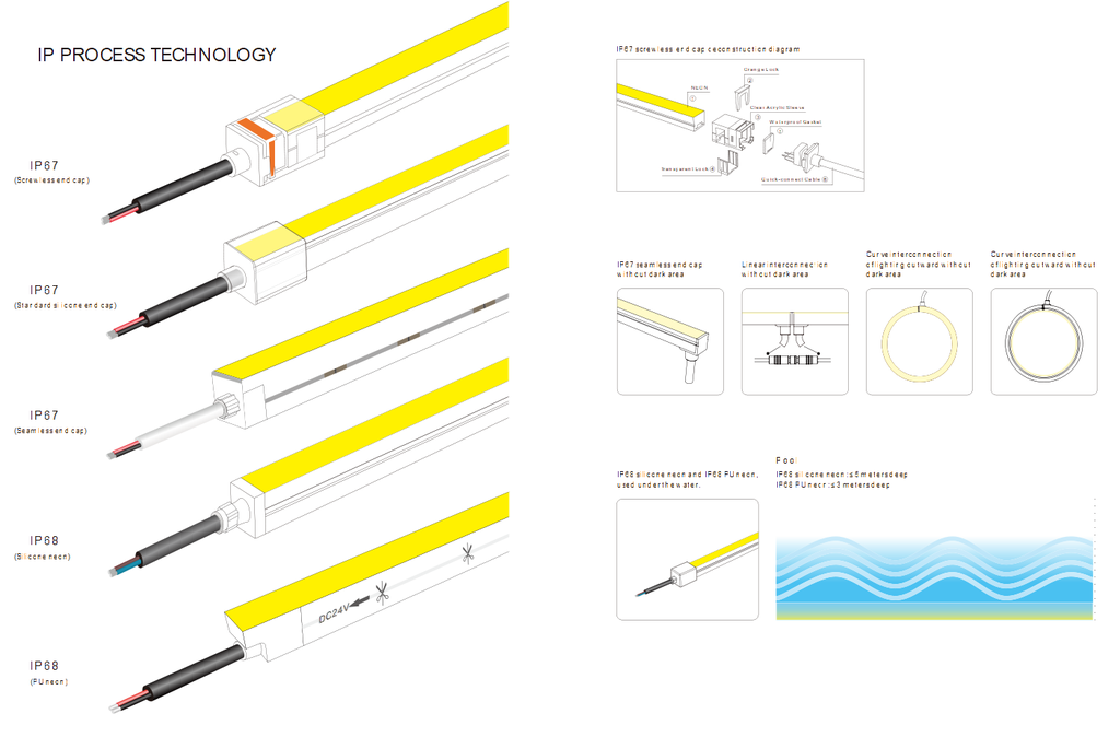 La bande flexible néon est composée de néons en silicone et de néons en polyuréthane. Le néon en silicone est IP67 et convient à une utilisation en intérieur comme en extérieur. Le néon en polyuréthane est IP68 et convient à une utilisation sous-marine.